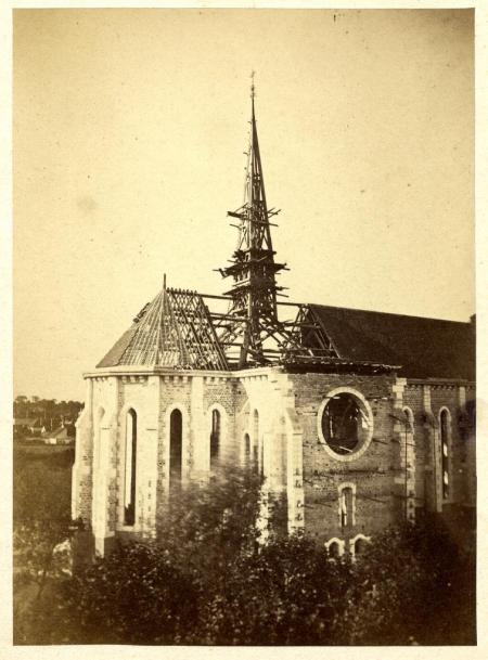 - En 1857, la ville accepta qu’un cimetière privé fût construit dans la propriété et l’architecte diocésain, Louis Lefort dessina les plans d’une chapelle mortuaire destinée à recevoir les restes des supérieurs de l’Institut. (4) Il faudra encore édifier la chapelle de la Communauté. Ce travail ambitieux sera entreprit en 1867. Comme le décrit à l’époque l’aumônier de St Antoine, le père Cornat : « Ce n’est pas une chapelle, c’est une véritable église aux belles et grandes proportions qu’il faut édifier dans une maison-mère dont le personnel est amené à grandir tous les jours ». Une fois de plus, la guerre de 1870 va bloquer les travaux et la consécration de l’église n’eut lieu que le 31 août 1873.